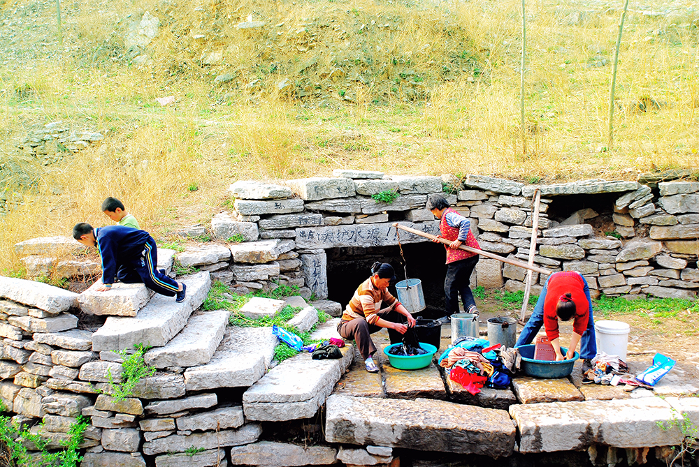 山东省平阴县白云峪村的一处水井旁,正在洗衣服的女人和玩玩耍的孩子。