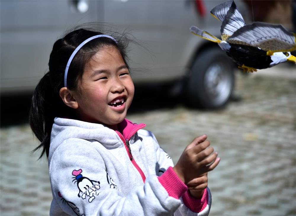 2018年4月7日,莱芜市桃花旅游文化节,一位小女孩正要抓住一只飞鸟玩具。