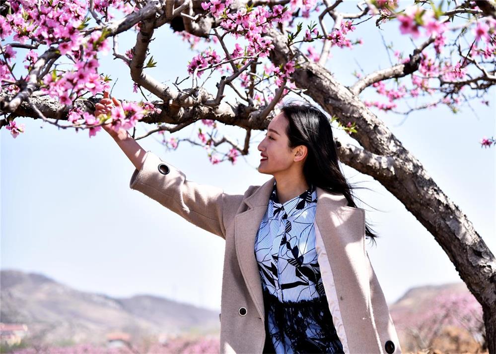 2018年4月,一位游客正在莱芜市桃花源风景区游玩。