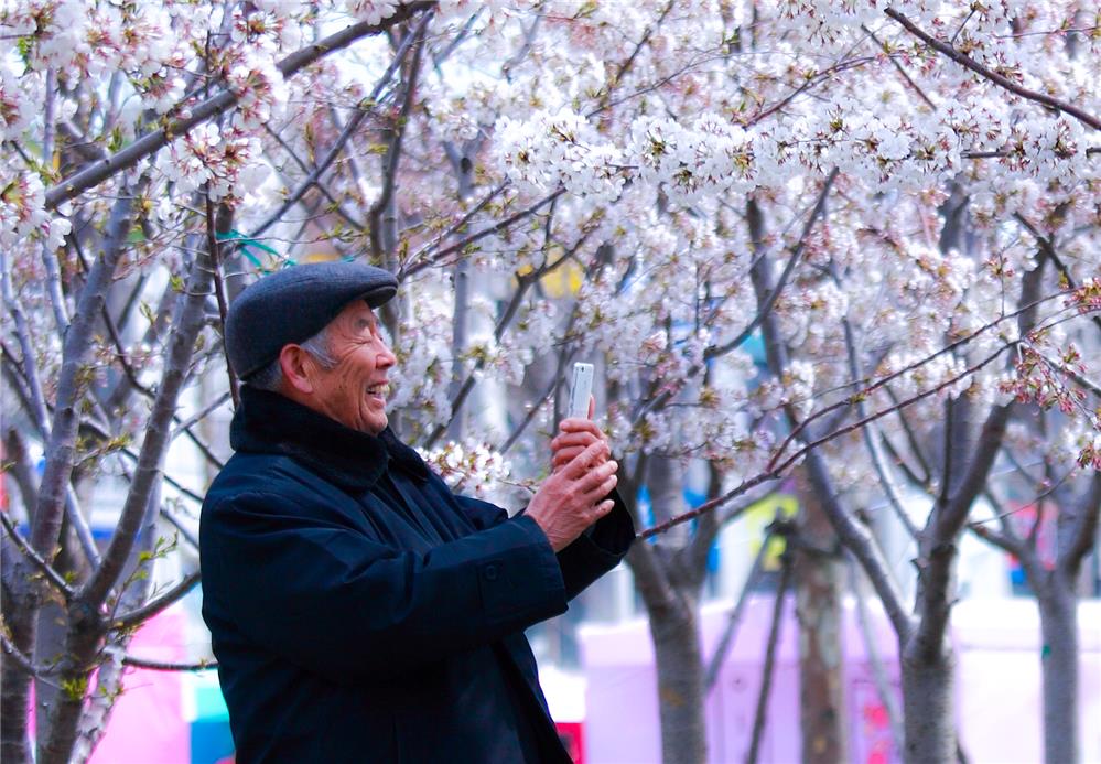 老人在樱花林中自拍,看到相机中的自己喜不自禁。