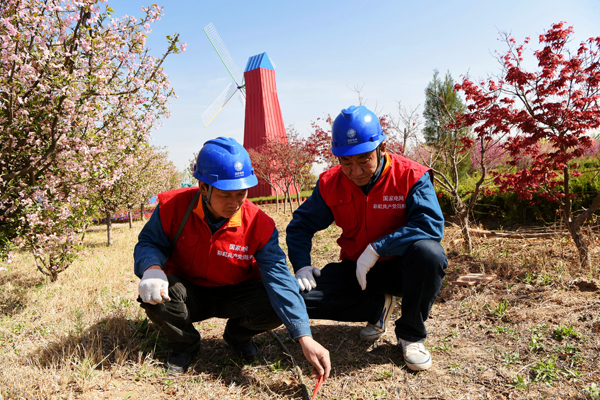 2018年4月15日,拍摄于山东济南济阳县新市镇花谷,电力员工对用电线路进行安全检查