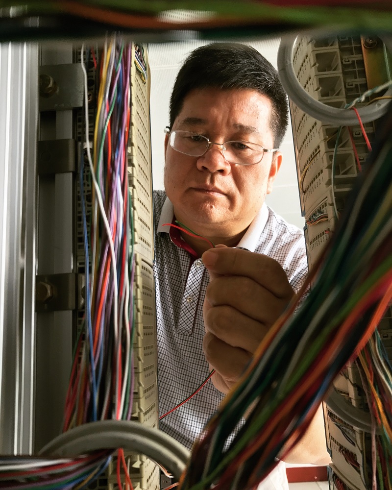 我的摄影作品:机房里的“纫针”人:拍摄地点:济南黄河河务局信息中心机房,时间:2017年8月28日。这副作品拍摄的是济南黄河河务局信息中心的一名管理电话配线架的老职工杜可贵。济南黄河河务局信息中心负责整个济南地区沿黄各河务局的通信工作,为保证通信线路正常,信息中心要保证全年365天不间断通信值守,在这里工作的职工们工作兢兢业业。因为管理的电话号码众多,工作需要极大的耐心和极为认真的工作态度,这副机房里的“纫针”人的照片就是源于此。作品采用框架式构图,通过配线架上繁杂而又整齐的电话跳线之间的空隙聚焦在主体人物上,而人物表情反映出工作的认真负责。这是一副我比较满意的作品,这副作品在济南黄河第三届摄影展上获得一等奖,受到了济南摄影协会副主席商扬和《济南画报》副主编祁凯两位领导的好评,所以我报上了这副摄影作品。